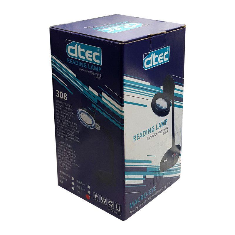 چراغ مطالعه ذره بین دار رومیزی DTEC-308 ابزاری است که باعث متمرکز شدن نور در یک نقطهی خاص میشود. به طور کلی، وظیفهی اصلی چراغ مطالعه فقط روشنایی محیطی است که در جلوی چراغ قرار دارد. به همین دلیل به آن چراغ مطالعه میگویند که هنگام خواندن کتاب،تعمیر برد،مونتاژ بردو کارهای که نور را بر روی وسیله مورد نظر پخش میکند. ذره بین رومیزی چراغدار DTEC-308 چراغ مطالعهی باکیفیت با قابلیت تنظیم شدت نور میباشد. طراحی این چراغ مطالعه به شکلی است که نمیگذارد به چشم ها با کار مداوم آسیب برسد، بدنهی DTEC-308 از ترکیب پلاستیک و فلز ساخته شده است. گردنی فلزی فنری این چراغ روی پایهای پلاستیکی نصب شده است. این گردنی میتواند زاویه و تابش نور لامپهای چراغ را تغییر دهد. بهاینترتیب کاربر هم میتواند روی یک نقطهی خاص تمرکز کند و هم با تغییر گاهبهگاه ارتفاع و زاویهی گردنی، مانع از خستهشدن چشم در اثر تابش یکنواخت نور شود. DTEC-308 انرژی لازم برای روشنشدن لامپش را از برق شهری میگیرد. لامپ LED به کار رفته در این چراغ مطالعه از نوع SMD و به دلیل مصرف انرژی پایین و نور سفید، از محبوبیت بسیاری برخوردارند. رنگ لامپ قرار گرفته در این چراغ مطالعه هم عاملی برای جلوگیری از خستگی چشم است.
