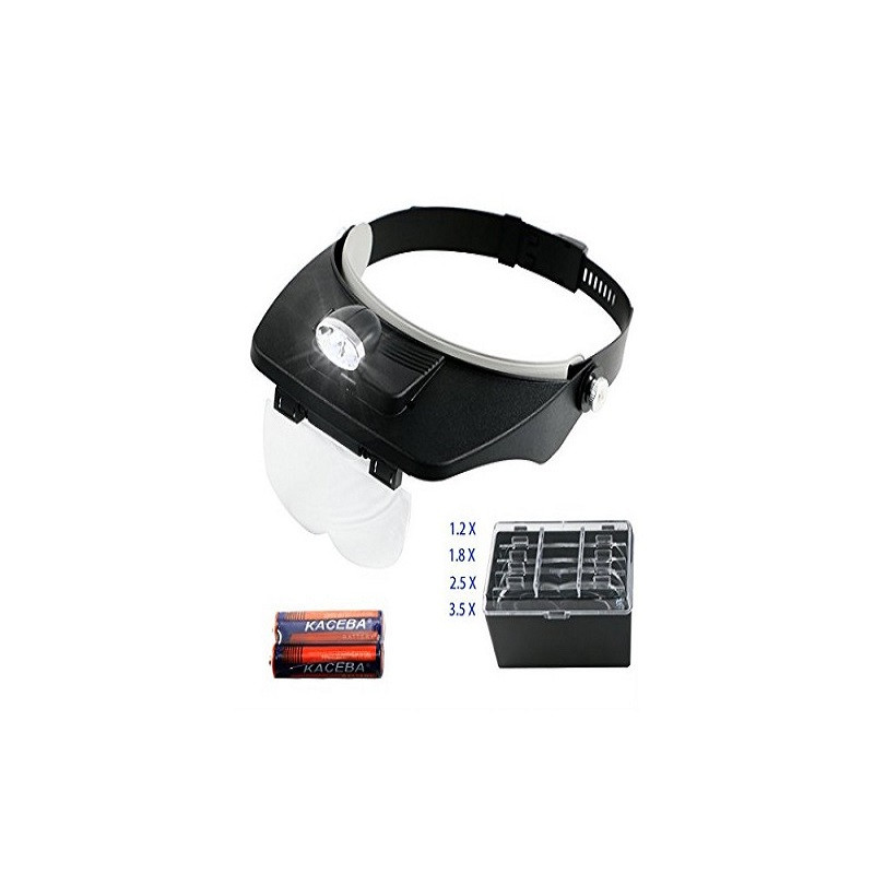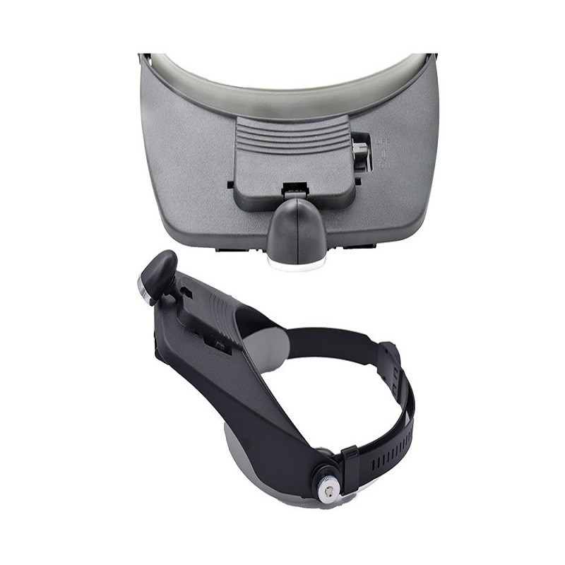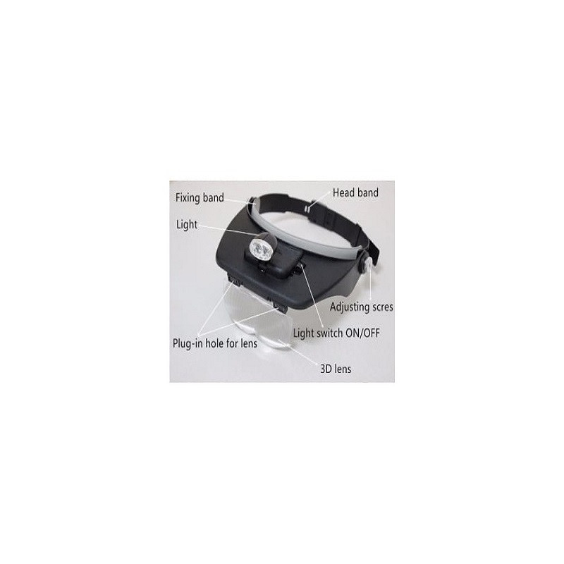 ذره بین پیشانی دارای 4 لنز با بزرگنمایی های 1.2X, 1.8X, 2.5X, 3.5X بوده که می توان آن ها را به صورت ترکیبی درون هدبند قرار داد و بزرگنمایی کل را بیشتر کرد. بست های این ذره بین هدبندی قابلیت کوچک و بزرگ شدن داشته و به فرد کمک می کند تا ذره بین را محکم روی پیشانی خود ببندد. ذره بین پیشانی بندی دارای یک LED در بالای خود بوده که با دو باتری نیم قلمی تغذیه می شود.