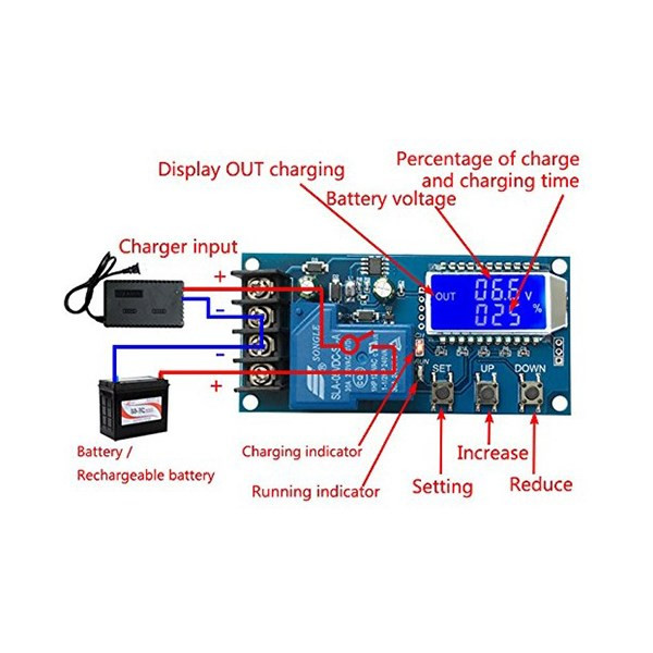از این ماژول برای کنترل کردن شارژ انواع باتری Lead-acid battery and Acting Battery ولتاژ 6V تا 60V استفاده میشود . دارای نمایشگر LCD دیجیتال، قابلیت تنظیم ولتاژ خروجی، محافظت شده در برابر اتصال کوتاه و اضافه بار، محافظت و شارژ انواع باتری، محافظت از دشارژ و تخلیه و قطع خودکار در صورت فول شارژ شدن Full Power Off Overcharge Protection Switch 6-60v
