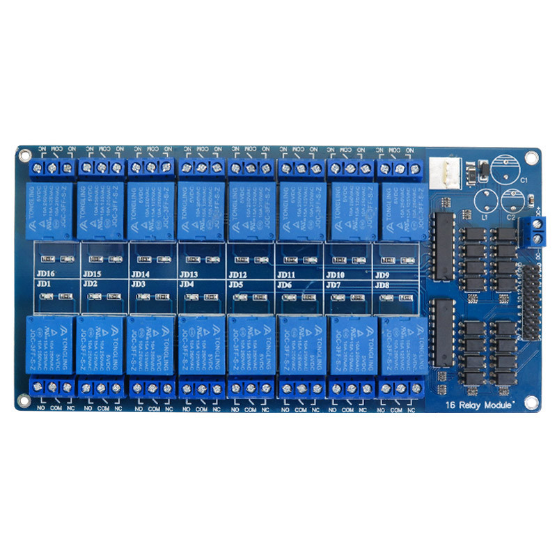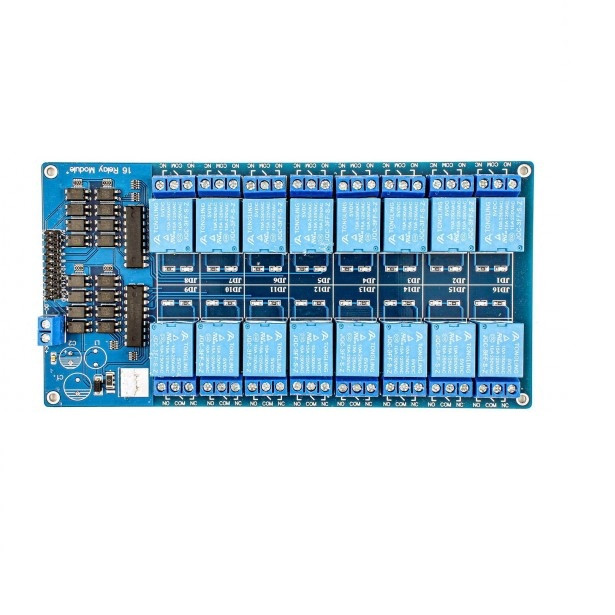 ماژول رله 5 ولت دارای 16 کانال میباشد که هر کدام از کانالها دارای جریان درایو 50-60 میلی آمپر است. همچنین مجهز به رله با جریان بالا AC250V 10A، DC30V 10A می باشد و دارای رابط استاندارد است که می تواند به طور مستقیم توسط میکروکنترلر کنترل شود (برای آردوینو، 8051, AVR, PIC, DSP, ARM, ARM, MSP430, TTL logic). همچنین این ماژول دارای نشانگرهای LED برای نشان دادن وضعیت خروجی رله می باشد.