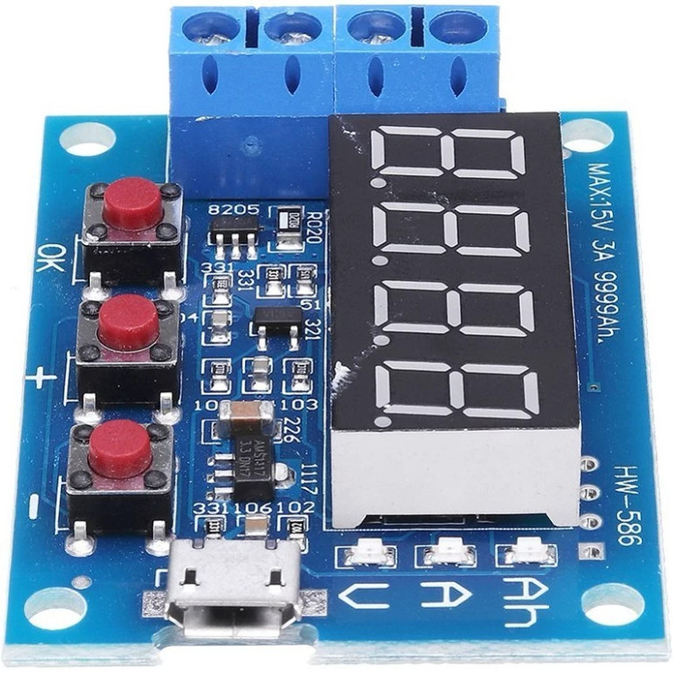به وسیله این ماژول میتوانید ظرفیت واقعی دشارژ انواع باتریها (تا حداکثر 15 ولت) را راستی آزمایی کنید. باتری های پشتیبانی شده: لیتیوم یون، لیتیوم پلیمر، نیکل متال هیدرید، نیکل منیزیم، نیکل کادمیوم، لید اسید، باتری های خشک جریان تست: تا حداکثر 3 آمپر با تغییر بار مقاومتی حداکثر ظرفیت قابل پشتیبانی: 9999 میلی آمپر ساعت قابلیت قطع خودکار با اتمام تست و رسیدن به ولتاژ دشارژ: دارد تغذیه ماژول از طریق میکرو یو اس بی (شارژر اندرویدی) راهنمای استفاده: ورودی میکرو یو اس بی، بار مقاومتی و باتری را مانند شکل متصل کنید. اکنون ولتاژ باتری روی صفحه نمایش داده میشود. با زدن دکمه های + و - ، ولتاژ پایان تست را تعیین کنید. با زدن دکمهی Ok تست شروع میشود. در زمان تست ظرفیت تخلیه شده، جریان لحظهای و ولتاژ باتری به صورت چرخشی نمایش داده میشود. با رسیدن ولتاژ باتری به ولتاژ قطع تعیین شده، تست خاتمه مییابد و ظرفیت واقعی دشارژ باتری نمایش داده میشود. با زدن دکمهی Ok چراغ چشمک زدن ثابت میشود. ولتاژ قطع برای باتری های مختلف: لیتیوم یون 3 ولت، لیتیوم پلیمر 3.3 ولت، لید اسید و خشک 12 ولتی 11.9 ولت، لید اسید و خشک 6 ولتی 5.9 ولت، نیکل متال-منیزیم-کادمیوم 1.2 ولت