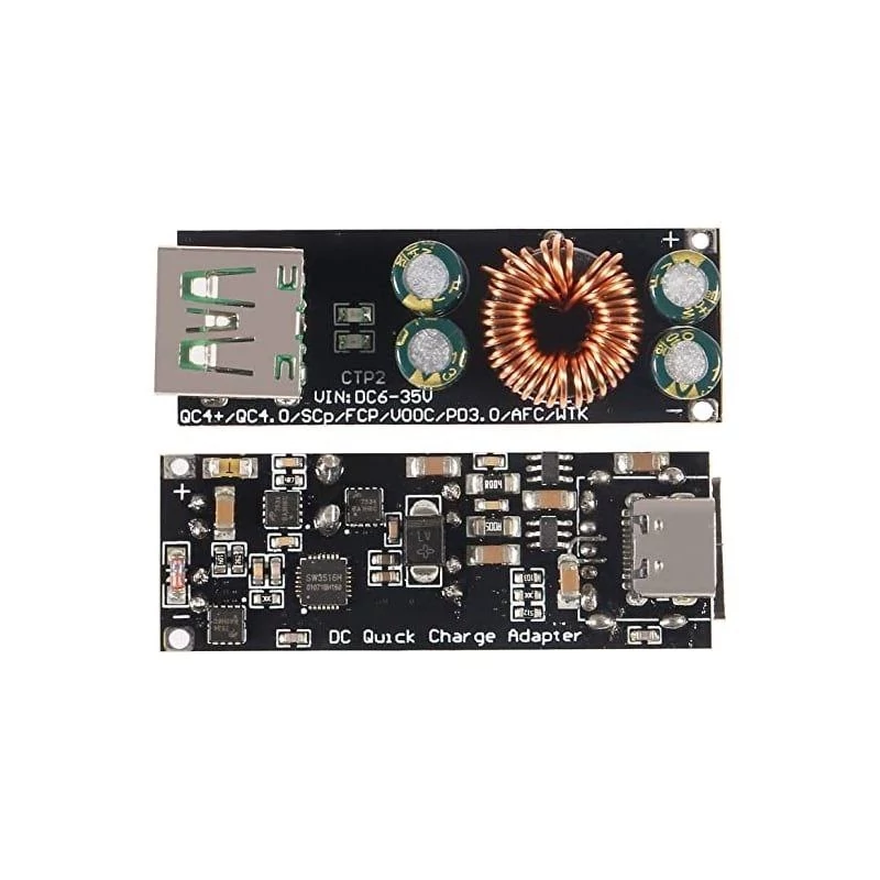 ماژول فست شارژ QC4.0-QC3.0 با ولتاژ ورودی 6 الی 35 ولت و خروجی پیش فرض 5 ولت ( به طور خودکار در 3-12 ولت ) که در پنل های خورشیدی برای شارژ تلفن همراه، سیستم شارژ خودرو ،منبع تعذیه سیستم صوتی خودرو و منبع تغذیه خانگی استفاده می گردد.به جای شارژر فندکی داخل خودرو که تکنولوژی سوپر فست شاژ را به شما می دهد.