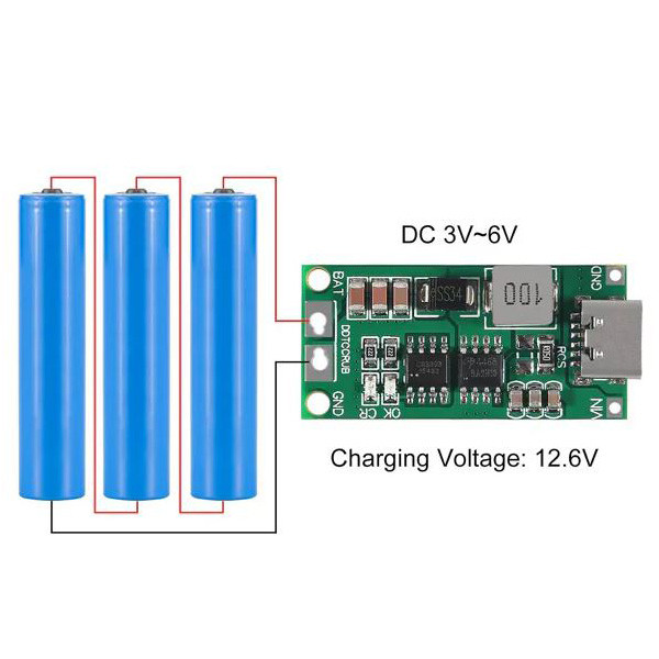 ماژول محافظ شارژ و دشارژ 3 سل 2 آمپر تایپ سی باتری لیتیوم یون TYPE C : معرفی این ماژول شارژر باتری های لیتیومی با دارا بودن درگاه USB TYPE-C امکان شارژ باتری های لیتیوم یونی در حالت ۳ سل را برای کاربر فراهم می کند این ماژول با جریان ۱ آمپری یک شارژر مناسب برای باتری های لیتیوم یونی می باشد. مشخصات نوع کالا : ماژول شارژ باتری لیتومی مدل : ۳S-۱A ولتاژ ورودی: ۳ الی ۶ ولت DC (پیشنهادی :۳.۷ الی ۵ ولت DC) جریان ورودی: ۱ آمپر (در ورژن ۱a) ولتاژ شارژ: ۱۲.۶ ولت DC جریان شارژ: ۰.۷۴ آمپر (در ورژن ۱a) فرکانس سوییچ : یک مگاهرتز شارژ اتوماتیک زمان کم شدن ولتاژ باتری از ولتاژ ورودی باتری مناسب : باتری لیتیوم یونی سایز ۱۸۶۵۰ دمای کاری ماژول : ۴۰- الی ۸۵+ درجه سانتری گراد محافظ اضافه ولتاژ دارد ابعاد : ۱۸x۳۹x۶.۵ میلیمتر وزن : ۴.۵ گرم نشانگر های LED LED نشانگر &#۳۹;&#۳۹;CR&#۳۹;&#۳۹; : ماژول در حال شارژ باتری می باشد . LED نشانگر &#۳۹;&#۳۹;OK&#۳۹;&#۳۹; : ماژول باتری را کاملا شارژ کرده یا حالت ولتاژ ثابت می باشد . کاربرد باتری های پخش کننده MP۳ باتری های پخش کننده MP۴ باتری های دوربین های دیجیتال باتری های تجهیزات صوتی و قابل حمل و ... نکته مهم استفاده در این ماژول ۱- این ماژول مدل ۳S-۲A می باشد و مناسب برای منابع باتری ۳ سلولی با جریان ورودی ۲ آمپری می باشد که تصویر سیم بندی کامل آن را می توانید در انتهای توضیحات مشاهده نمایید ۲- برای انتخاب اتری باتری دقت نمایید که نوع و آمپراژ باتری ها از یک سری و یک مدل و سالم باشد (مثال ۳ عدد باتری لیتیوم یونی ۳.۷ ولتی ۵۰۰ میلی آمپر) ۳- در سیم بندی دقت گردد تا از بروز آسیب به ماژول یا باتری ها جلوگیری شود . ۴- در صورتی که از آداپتور شارژر های تلفن همراه استفاده می کنید از ۲ آمپر بودن شارژر اطمینان حاصل نمایید در غیر این صورت از منابع تغذیه ای که ۲ آمپری هستند می توانید استفاده نمایید ۵- باتری های با ظرفیت بالاتر در مدت زمان طولانی تر شارژ خواهند شد