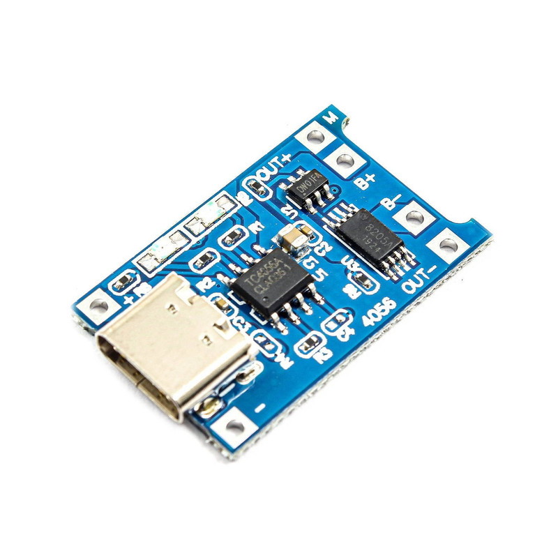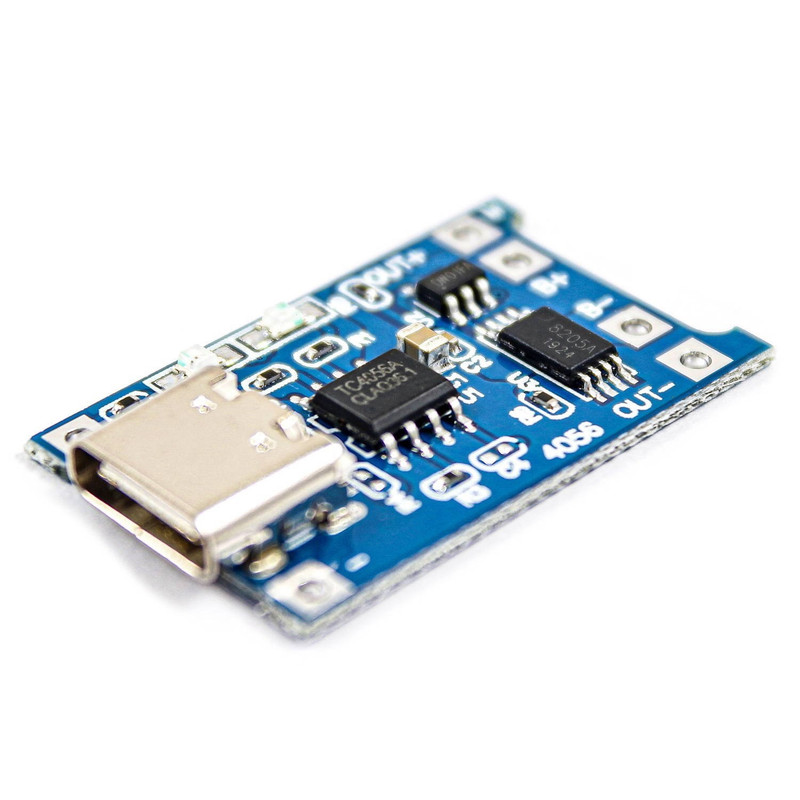 ماژول شارژر باتری لیتیومی، یک ماژول الکترونیکی است که با استفاده از تراشه TP4056 و یک پورت USB Type C، میتوان از آن جهت شارژ کردن باتریهای لیتیومی و همچنین شارژ باتریهای گوشی موبایل بهره برد. این ماژول حاوی دو نشانگر LED میباشد که برای نمایش وضعیت باتری، محافظت از شارژ و دشارژ باتری مورد استفاده قرار می گیرد. از دیگر ویژگیهای این ماژول میتوان به دقت بالا، عملکرد حفاظتی خوب از برد، کاهش خودکار جریان و جلوگیری از سوختگی و آسیب به تراشه اشاره نمود. جهت استفاده از ماژول می توان پورت میکرو USB را به شارژر گوشی وصل نمود. سپس پورت میکرو USB را به شارژر گوشی وصل کرد. و در نهایت قطب های باتری لیتیوم یون به مثبت و منفی B وصل میشود. اگر می خواهید از بارهای الکترونیکی قوی تری مثل لامپ، اسباب بازی، موبایل و ... استفاده کنید، باید از پایه های OUT + و OUT- ماژول استفاده کنید تا در مقابل جریان بالا محافظت گردد. توجه داشته باشید که آمپرمتر باید به ورودی 5 ولت متصل شود. برای افزایش طول عمر باتری باید جریان شارژ به اندازه 37 درصد ظرفیت باتری باشد. (برای مثال اگر یک باتری 1000 میلی آمپر بر ساعت دارید، باید جریان 400 میلی آمپر باشد) همچنین به منظور رسانایی بهتر سیم اتصالات نباید بیش از اندازه ضخیم باشند. در صورتیکه ولتاژ ورودی بالاتر از 5 مثلا 5.2 ولت باشد، بهتر است جریان کمتر از 1000 میلی آمپر باشد. (رعایت این مساله باعث حفاظت از مدار می گردد و از سوختن آن جلوگیری می کند).