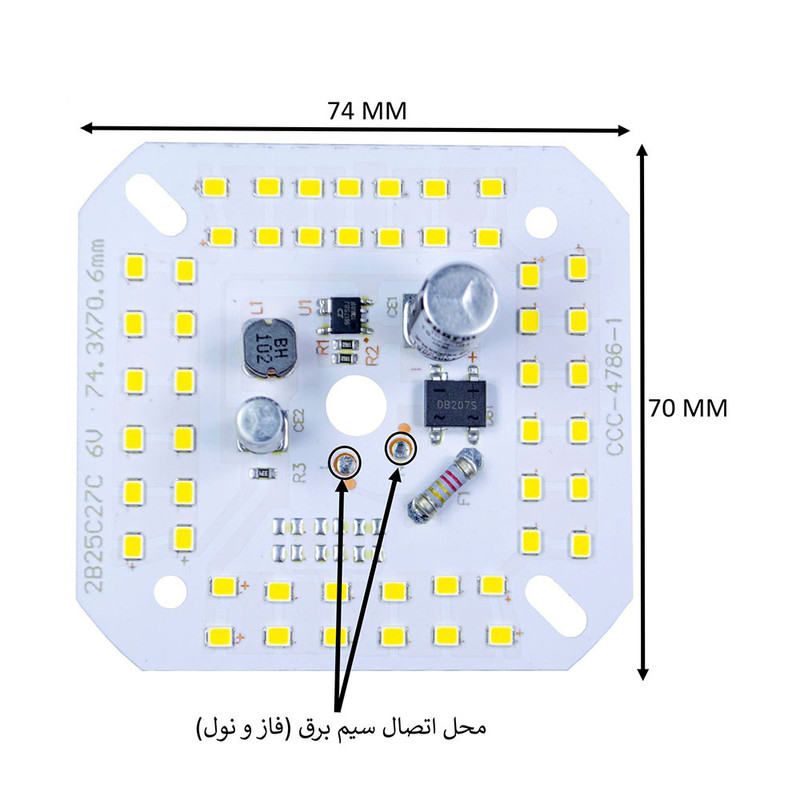 این چیپ مجهز به خازن آنتی شوک میباشد که هم از لرزش و چشمک زدن نور جلوگیری میکند و هم باعث افزایش نور چیپ میشود . این چیپ با برق مستقیم شهری (220 ولت) روشن میشود و در تعمیر یا ساخت لامپ ها و پرژکتور ها و پنل های ال ای دی استفاده میشود . جهت استفاده از این چیپها پیشنهاد میشود با استفاده از خمیر سیلیکون به خنک کننده آلومینیومی (heat sink) مناسب به منظور جلوگیری از افزایش دمای چیپ و کاهش عمر محصول چسبانیده شود . این محصول دارای 50 عدد ال ای دی , شار نوری 5250 لومن و طول عمر 40000 ساعت میباشد . روی چیپ دو حرف L و N وجود دارد که فاز و نول به آنها متصل میشود .