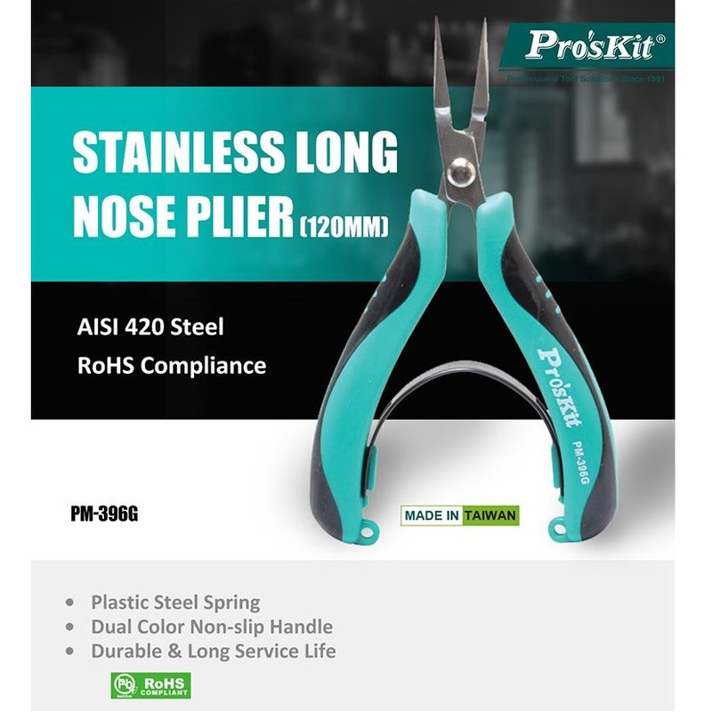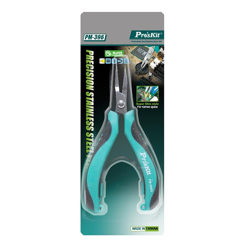 انبر دم باریک PM-396G ساخت شرکت تایوانی پروسکیت از فولاد ضد زنگ AISI 420 ساخته شده که تمیزی و مقاومت در برابر خوردگی را تضمین می کند. همچنین برای راحتی کاربر از دستگیره های TPR دو رنگ بدون لغزش استفاده شده و یک فنر پلی اکسی متیلن (POM) برای عملکرد خود باز شونده در این دم باریک به کار رفته است .