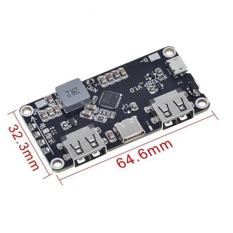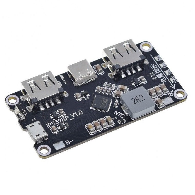 این محصول یک ماژول پاوربانک با خروجی فست شارژ 3 (QC 3) است. حداکثر توان خروجی این ماژول 18 وات بوده، دارای دو خروجی یو اس بی و دو ورودی میکرو یو اس بی و تایپ سی است. روی برد 5 عدد ال ای دی وجود دارد که 4 عدد از آنها برای نمایش وضعیت باتری و شارژ و دیگری برای نمایش فعال بودن حالت فست میباشد. مزیت مهم این ماژول، پشتیبانی از حالت فست شارژ هم در حالت خروجی و هم در حالت ورودی (برای شارژ شدن پاوربانک) میباشد. برای شارژ شدن پاوربانک در حالت فست، از شارژر 5 ولت با جریان حداکثر 3.5 آمپر میتوانید استفاده کنید. فست شارژ حالت خروجی، روی هر دو پورت USB قابل استفاده است، ولی در صورت اتصال بیش از یک مصرف کننده، حالت فست غیر فعال شده و ولتاژ خروجی 5 ولت خواهد بود. برای راه اندازی این ماژول لازم است باتریهای موازی شده را به +B و -B متصل کنید. در هنگام اتصال باتری ها به ماژول به مثبت و منفی ماژول توجه داشته باشید زیرا در برابر ولتاژ معکوس حفاظت نشده و در صورت اتصال معکوس ماژول آسیب خواهد دید. دقت کنید که به منظور فعال شدن حالت فست شارژ در خروجی، لازم است مجموع باتریهای متصل شده توانایی ارائهی حداقل 6 آمپر جریان را داشته باشند. از این رو توصیه میشود از باتریهای نو، با کیفیت و با جریان دهی (C ریت) بالا استفاده کنید. همچنین توجه نمایید که به دلیل عبور جریان بالا از باتریها به ماژول، از سیم ضخیم (حداقل سطح مقطع 0.5 میلیمتر) برای اتصال باتریها به ماژول استفاده نمایید و محل اتصالات را به خوبی با قلع محکم نمایید. گرم شدن سیم و نقاط اتصال در زمان کارکرد ماژول، نشانهی ضعیف بودن آنهاست و میتواند موجب غیر فعال شدن حالت فست پاوربانک شما شود. محدودیتی در تعداد باتریهایی که به این ماژول متصل میشوند وجود ندارد و هر تعداد باتری لیتیومی (لیتیوم یون - لیتیوم پلیمر) را میتوان موازی و به ماژول متصل نمود. به منظور تامین جریان لازم برای ماژول (6 آمپر) توصیه میشود از 4 باتری یا بیشتر که هر کدام دارای 1.5 آمپر جریان خروجی (یا بیشتر) باشند استفاده کنید. با موازی کردن باتریهای بیشتر، ظرفیت پاوربانک شما بیشتر خواهد شد.
