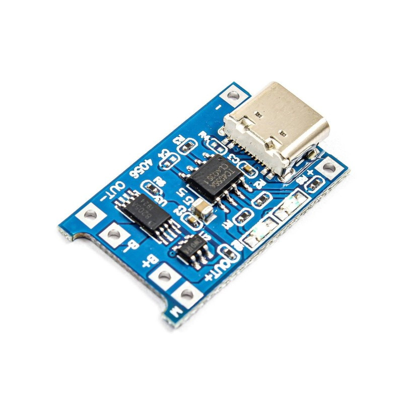 ماژول شارژر باتری لیتیومی TC4056/TP4056 یک ماژول کاربردی برای شارژ و دشارژ باتری های لیتیومی است . بوسیله این ماژول میتوان یک باتری تک سلول لیتیومی 3.7 ولت مانند 18650 که مدار محافظ داخلی ندارد را و با حفاظت کامل شارژ کرد و همچنین دشارژ باتری را نیز کنترل کرد . یک باتری لیتیومی باید به گونه ای شارژ شود که با رسیدن ولتاژ به 4.2 ولت جریان شارژ قطع شود همچنین دشارژ آن باید به گونه ای باشد که که با رسیدن ولتاژ باتری به 2.4 ولت دیگر باتری دشارژ نشود . در غیر این صورت عمر باتری کم شده و باتری آسیب میبیند . در طراحی این ماژول از آی سی شارژ TC4056 و یا TP4056 و آی سی حفاظت DW01 استفاده شده که باعث میشود باتری لیتیومی با حفاظت کامل و بدون خطر شارژ و دشارژ شود . به این صورت که آی سی DW01 جریان شارژ را توسط ماسفت 8205A بر روی یک آمپر تنظیم می کند و بعد از شارژ کامل یعنی رسیدن ولتاژ باتری به 4.2 ولت عملیات شارژ را قطع می کند. همچنین در زمان دشارژ باتری با رسیدن ولتاژ باتری به 2.4 ولت جریان بار توسط آی سی DW01 قطع میشود تا ولتاژ باتری به کمتر از 2.4 ولت نرسد . در صورتی که ولتاژ باتری وصل شده به ماژول کمتر از 2.9 ولت باشد ماژول شارژ را با جریانی در حدود 130 میلی آمپر آغاز تا زمانی که ولتاژ باتری به 2.9 ولت برسد سپس جریان شارژ به صورت خطی افزایش می یابد . برای استفاده از این ماژول در ابتدا تغذیه 5 ولت ماژول را تامین کنید ، این کار از دو طریق امکان پذیر است ، یا از طریق پورت میکرو USB TYPE C اندرویدی روی ماژول و یا از طریق دو پد دو طرف پورت که با مثبت و منفی مشخص شده اند . منبع تغذیه باید به گونه ای انتخاب شود که حداقل بتواند یک آمپر خروجی داشته باشد . مثبت و منفی باتری را با دقت به دو پدی که با B+ و B- مشخص شده اند متصل کنید . (دقت شود که به درستی متصل شود در غیر این صورت ماژول آسیب میبیند) مصرف کننده ( اسباب بازی ، لامپ و .. ) باید به دو پد OUT+ و OUT- وصل شود و اگر مصرف کنند مستقیم به باتری وصل شود حفاظت در برابر دشارژ بیش از حد انجام نمی شود . لازم به ذکر است که در زمان شارژ باتری نباید مصرف کننده به ماژول متصل شود در زمان شارژ ال ای دی قرمز رنگ روشن می شود و هنگام شارژ کامل ال ای دی سبز روشن می شود .