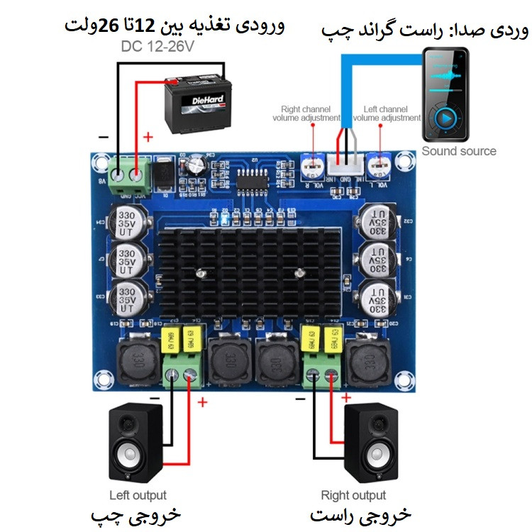 ولتاژ ورودی این ماژول شامل رنج 12 تا 26 ولت می باشد که باعث استفاده آسان تر این ماژول در کاربردهای مختلف خواهد شد (برای داشتن کیفیت توان و صدای مطلوب تر، ولتاژ ورودی توصیه شده 24 ولت می باشد). از این کیت به عنوان یک تقویت کننده صوتی با کیفیت بسیار بالا می توان بهره برد. اگر از برق باتری اتومبیل برای منبع تغذیه استفاده می شود حتما باید فاقد نویز باشد و در صورت نیاز از ماژول کاهنده ولتاژ DC استفاده شود.