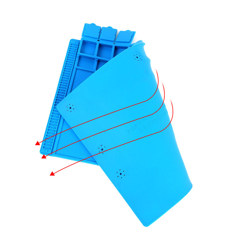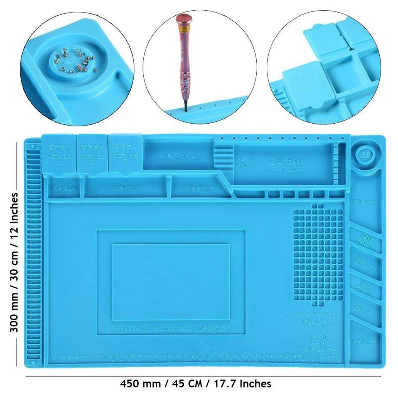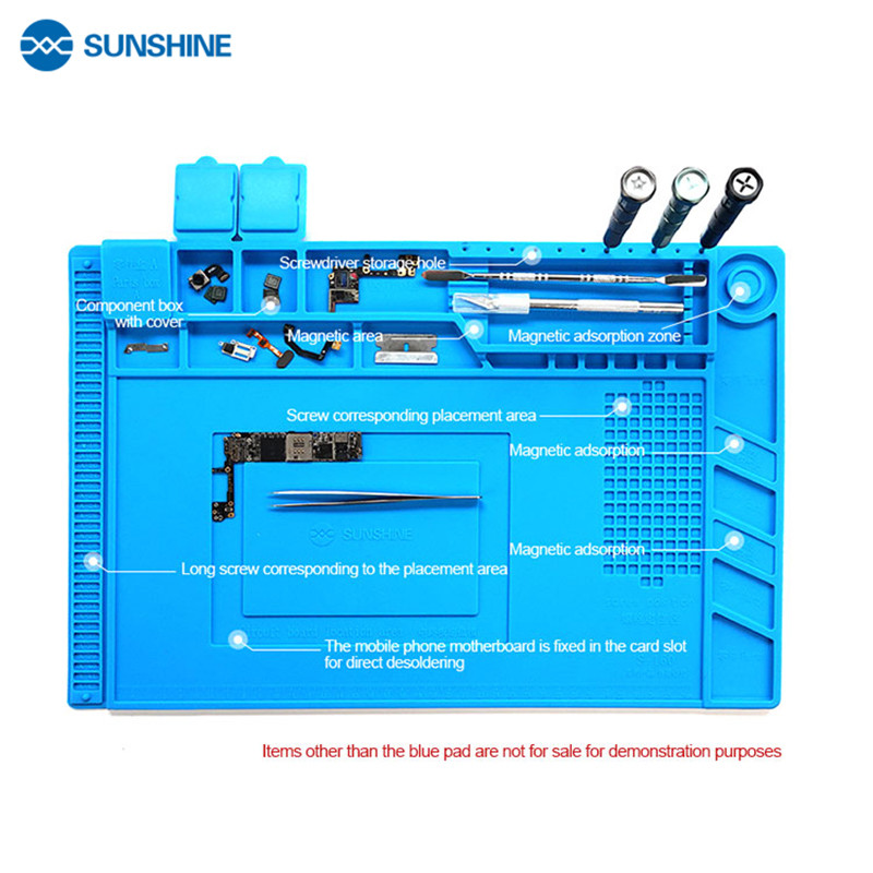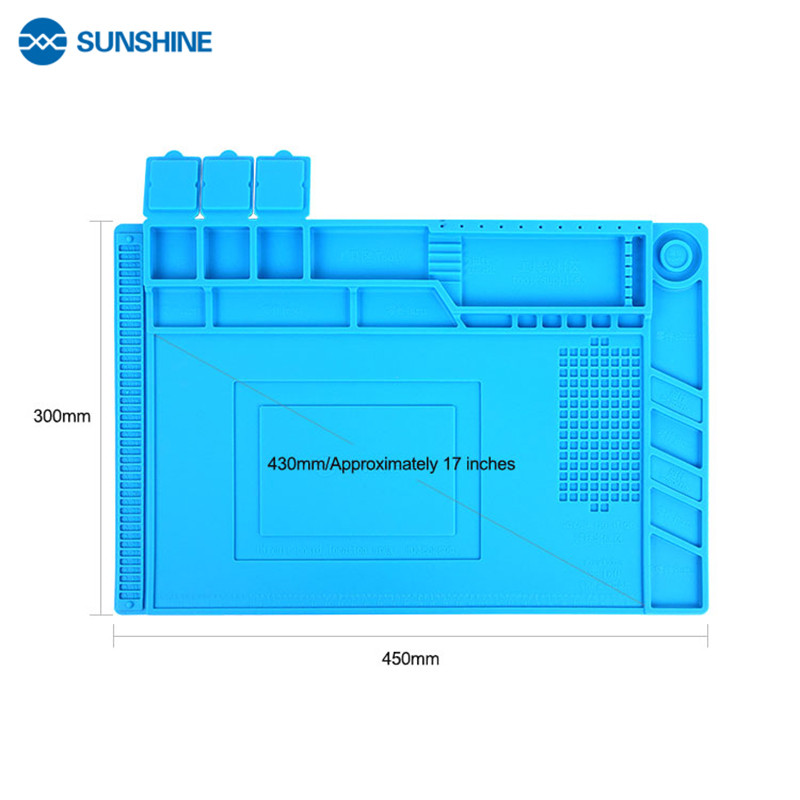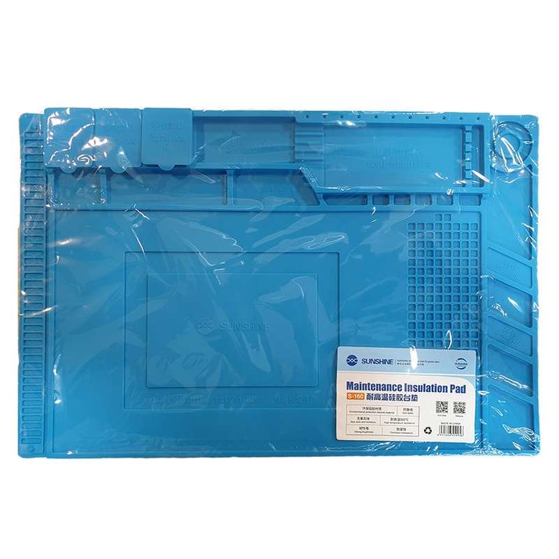 پد نسوز لحیم کاری مارک سانشاین مدل S160 با ابعاد 30 در 45 سانتی متر از جنس پد سیلیکون نسوز با تحمل حرارت تا 500 درجه سانتی گراد و دارای مگنت جهت قرارگیری پیچ های باز شده از روی دستگاه میباشد. در قسمت سمت چپ دارای شماره بندی جهت مشخص نمودن ترتیب پیچ های باز شده از روی دستگاه است.