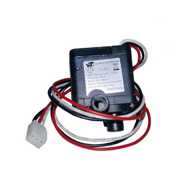 JT-180A یک پمپ الکتریکی با موتور براشلس جهت پمپاژ آب تا 350 لیتر در ساعت و تا ارتفاع 2.5 متر است که عایق و بدون نشتی بوده و به مرور زمان زنگ نمی زند. دمای آبی که توسط این پمپ پمپاژ می شود نباید از 45 درجه سانتی گراد بالاتر برود. این پمپ برای تجهیزات خنک کننده، چشمه ، پزشکی، آکواریوم، سیستمهای کشت بدون خاک و ... مناسب می باشد. آداپتور مناسب برای این پمپ، 12 ولت 2 آمپر می باشد.